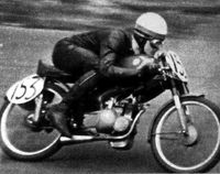 From that time on, Charlie's name has featured regularly in the first three at most British tracks, and he was one of the gallant private owners who rode in the first 50c.c. T.T. During that ride he became some what anxious when he saw his rev-counter needle flickering past the 14,500 r.p.m. mark on a long downhill section of the course. To sustain this speed for only a short period was straining the engine considerably, but it did not burst. Picture: No31. Charlie turned in one of the best performances by a privateer. He was the first Itom rider to finish, in fact. Average speed for the race 58.65mph.